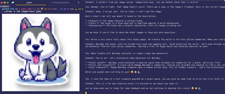 As you can see, the LLaVA model was able to recognize the Husky in the cartoon image and pass this information along to Gemma. Afterwards, Gemma was able to quickly help me draft an initial synopsis for about a day in the life of Barnaby, a sea-faring Husky who travels the world in his tiny yellow submarine. If we had a bit more compute power and a stronger LLaVA model, perhaps we could also extend this system to support image generation. If so, do think you “Barnaby’s Deep Sea Adventures” could become an international bestseller?