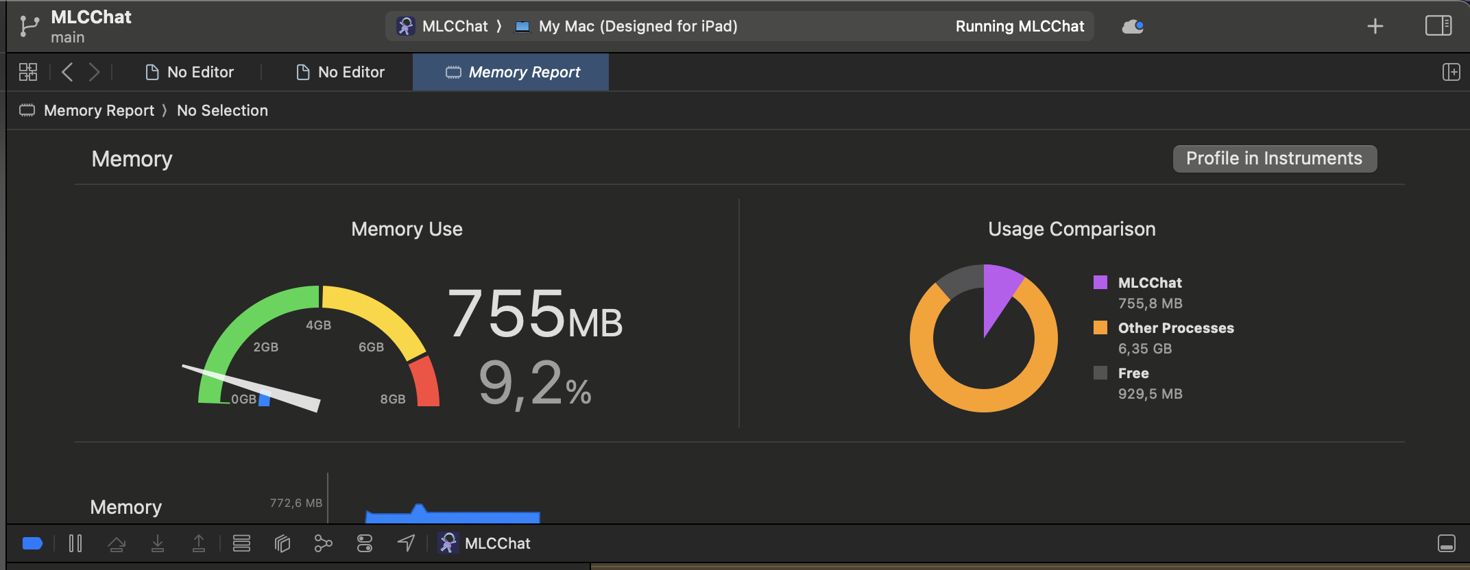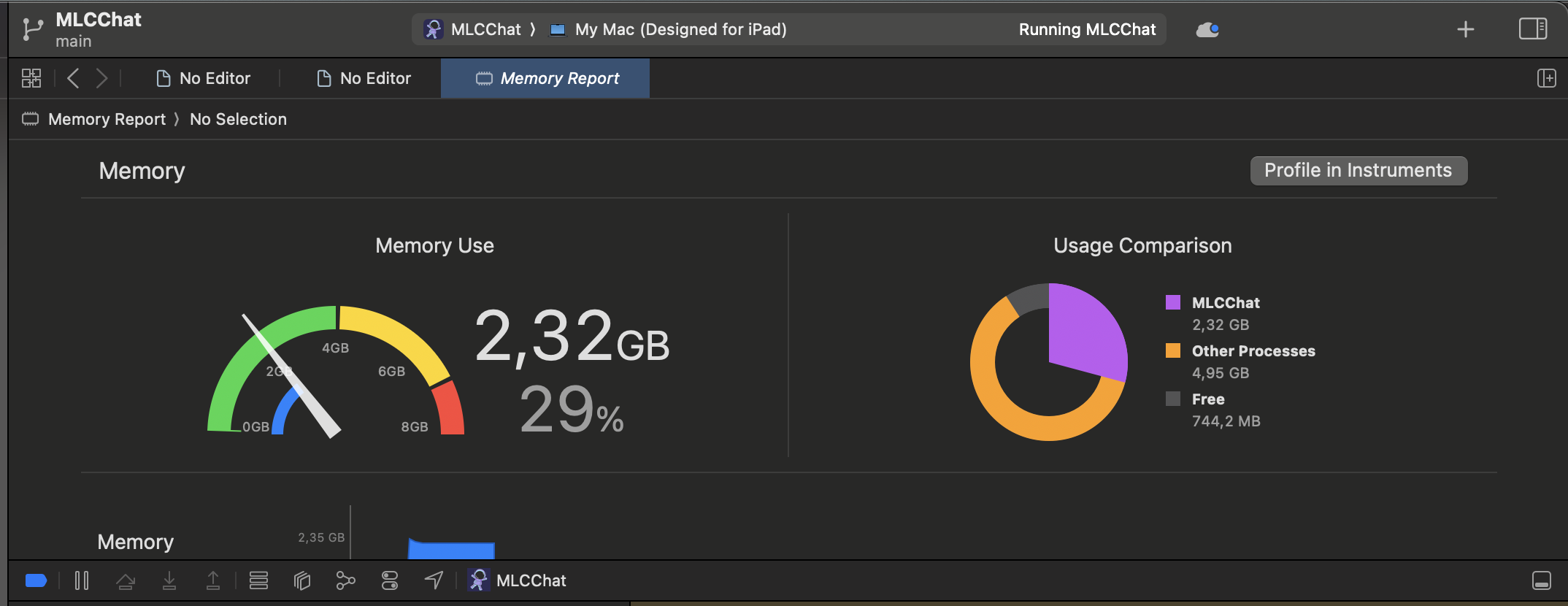 Perplexed, I checked my iOS app’s memory consumption in Xcode after I opened a new chat with Gemma. Well, it turns out that Gemma consumes a bit over 2GB of RAM. Given that this borrowed iPad only has 4GB of RAM in total, it’s not a surprise that the iOS application was crashing. Even when I closed all other applications, other background processes were consuming this iPad’s limited and valuable memory.