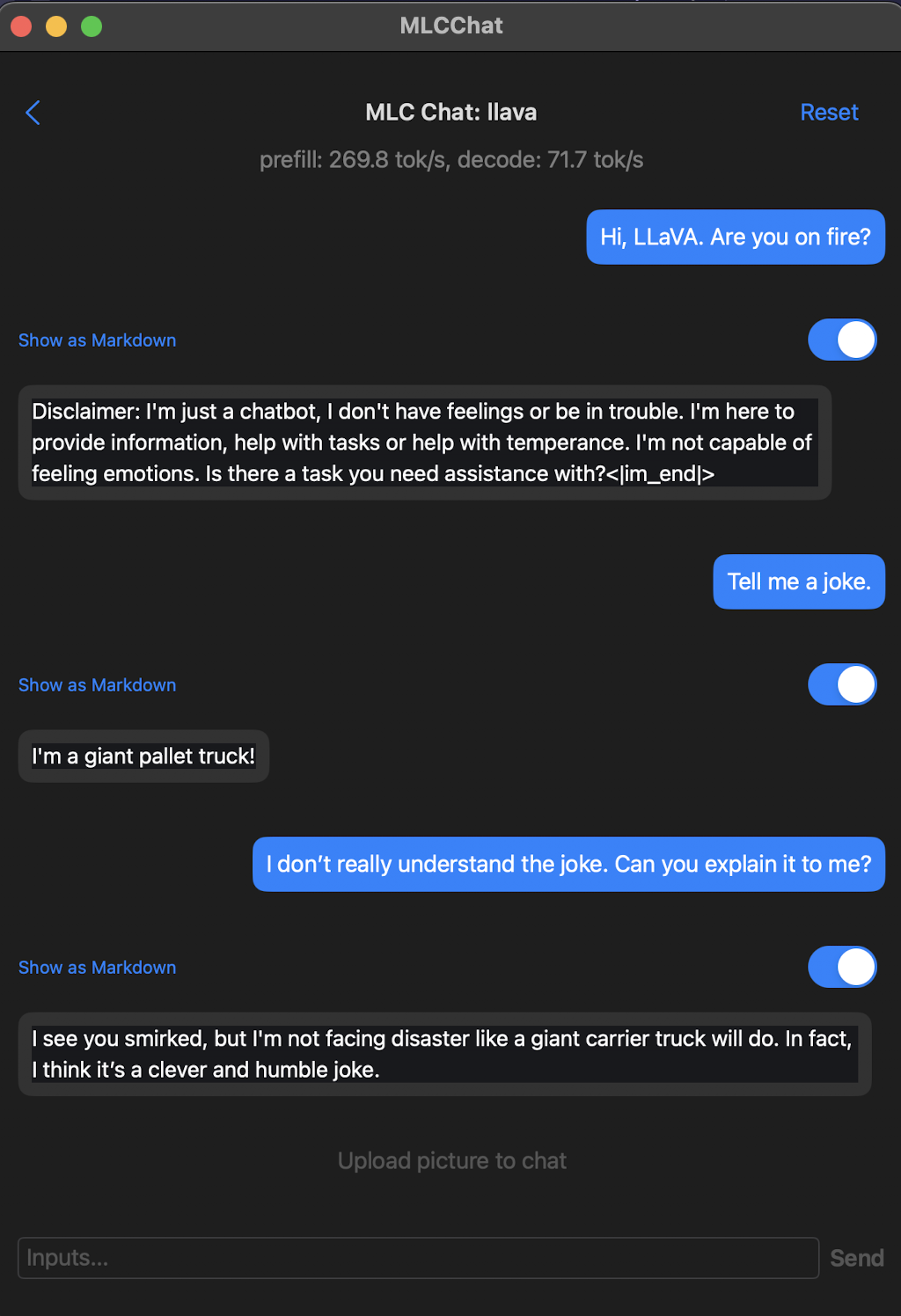 Of course, that’s a lot of conditions. Nonetheless, it’s incredible seeing how projects like the Machine Learning Compiler have democratized access to foundation models. Whether you’re moonlighting as an entrepreneurial or are a curious university student, you can get easily started deploying your own single-modal LLMs on edge today. Maybe in another 6 months, the tooling will have advanced to the point that it fully supports multi-modal chat — including image generation.