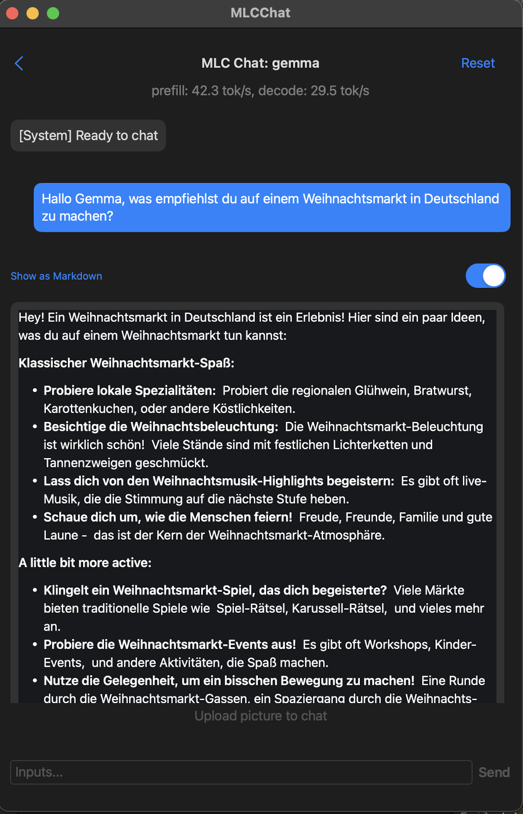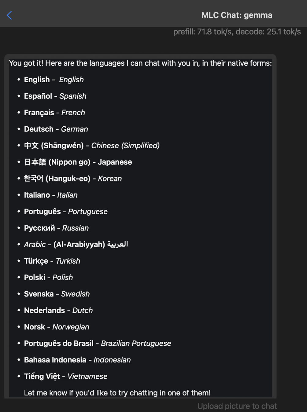 Fast forward to November 2024, I decided to try the same task as before but with the Machine Learn Compiler (MLC) LLM Engine. This time, I deployed a pre-quantized version of this Gemma 2B model onto an edge device — specifically, an iOS app. The results blew me away.